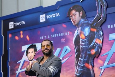 Puerto Rican-American film director Angel Manuel Soto holds a cut out of Xolo Mariduena as he attends a screening of the film Blue Beetle in Los Angeles, California, U.S., August 15, 2023. REUTERS/Mario Anzuoni