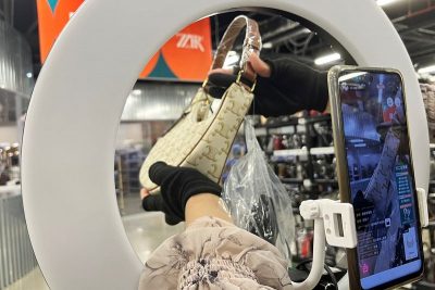 Livestreamer promotes a bag at the ZZER warehouse in Shanghai