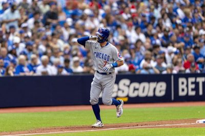Aug 12, 2023; Toronto, Ontario, CAN; Chicago Cubs shortstop Dansby Swanson (7) celebrates after hitting a home run against the Toronto Blue Jays during the fourth inning at Rogers Centre. Mandatory Credit: Kevin Sousa-USA TODAY Sports