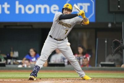 Aug 20, 2023; Arlington, Texas, USA; Milwaukee Brewers catcher Victor Caratini (7) reacts to an inside pitch thrown by Texas Rangers starting pitcher Max Scherzer (not shown) during the first inning at Globe Life Field. Mandatory Credit: Jim Cowsert-USA TODAY Sports