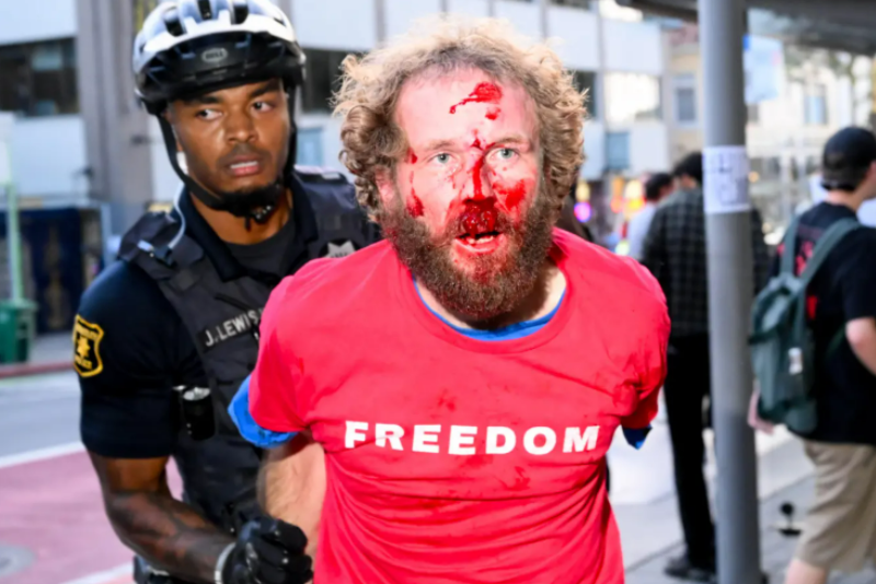 As the evening progressed, an onslaught of violent confrontations broke out between protesters, campus police, and conservative attendees attempting to enter the venue. Videos shared on social media showed people throwing punches and those in shouting matches, in addition to one man wearing a red “FREEDOM” T-shirt who was photographed with blood streaming down his face after an altercation.