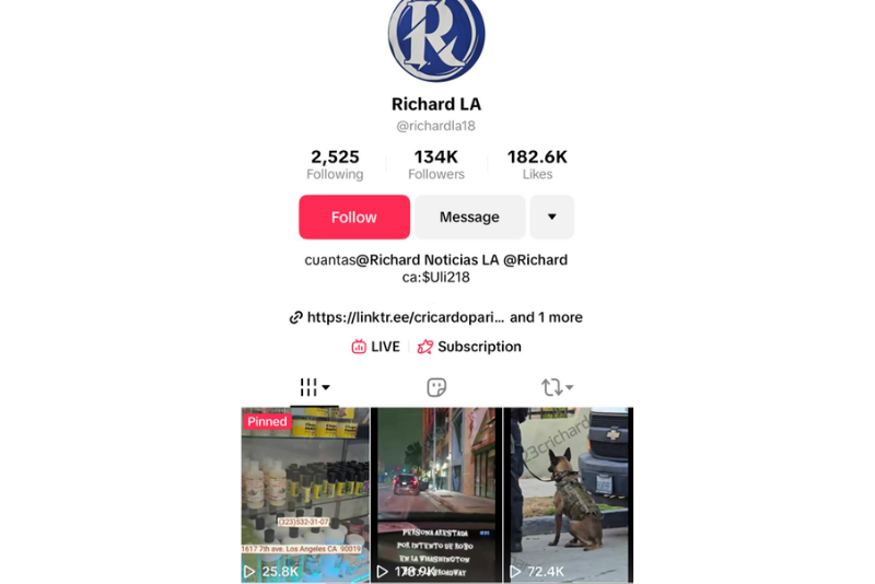 On his TikTok account, @richardla18, Parias frequently posts videos recording and doxing ICE enforcement tactics while documenting the detentions of other illegal aliens. Many of his clips — some garnering hundreds of thousands of views — show him filming agents from a distance, sometimes narrating the events in Spanish and encouraging viewers to “know their rights.”