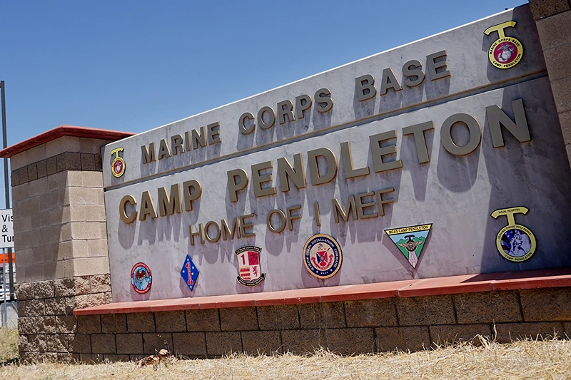 CAMP PENDLETON, CA - JULY 26: View of the main entrance to Camp Pendleton on July 26, 2019 in Oceanside, California. Sixteen Marines were arrested at Camp Pendleton Thursday morning during battalion formation for various illegal activities ranging from human smuggling to drug-related offenses. (Photo by Sandy Huffaker/Getty Images)