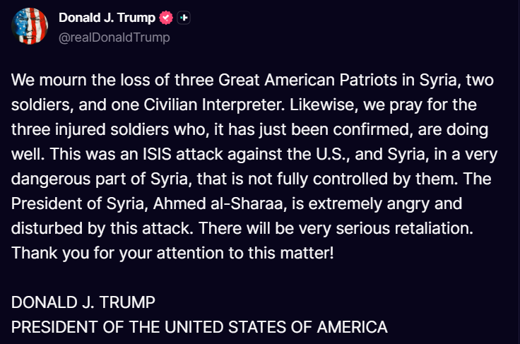 Syria’s government claimed that the now-deceased ISIS shooter, a member of its security forces, had been investigated days earlier for “possible extremist views.” Nonetheless, President Donald Trump openly promised retaliation as soon as he was briefed on the tragedy.