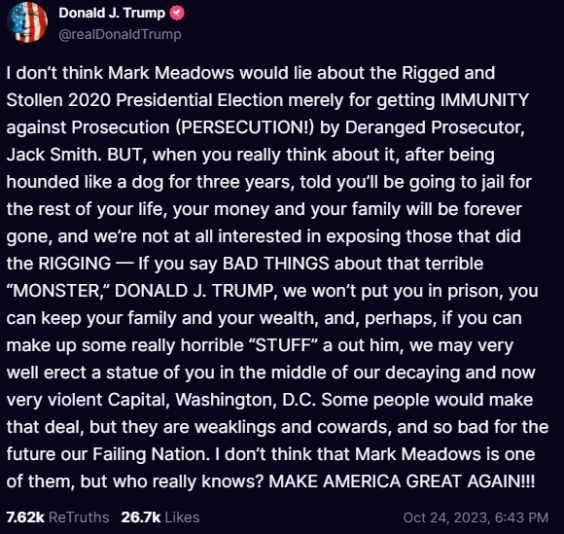 “Think of the total situation here,” Kelly said. “You have a leak to the news media, one that Mark Meadow’s team has denied. Someone probably with Jack Smith’s office leaks this to a major news organization. They post it. It goes viral, and then Mark Meadow’s team denies it. But Donald Trump can’t say anything about it. He can’t even respond publicly. His lawyers can’t respond publicly.”