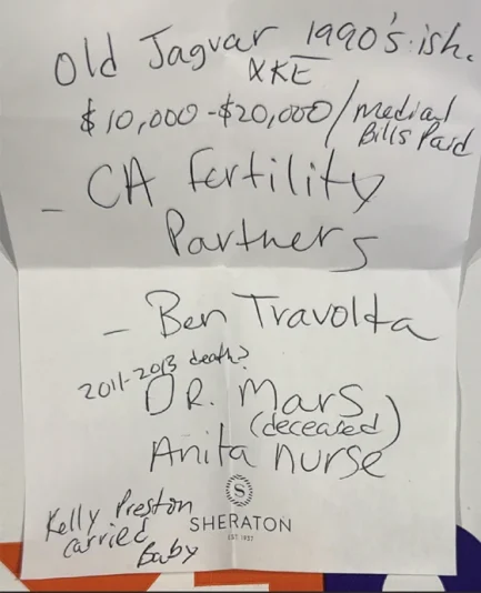 The note also mentions a doctor and nurse connected to the matter, and names Kelly Preston as the person who carried the baby. Preston was 57 when she passed away in 2020 after a battle with breast cancer.