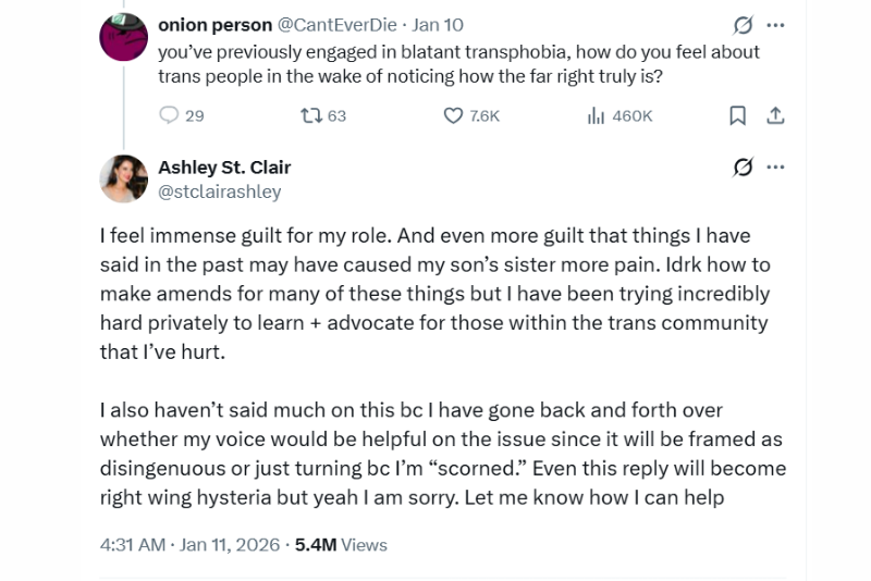 St. Clair recently distanced herself from her past rhetoric, which once framed transgenderism as the celebration of a mental health crisis, in favor of a new-found commitment to “privately learning and advocating” for individuals with gender dysphoria.