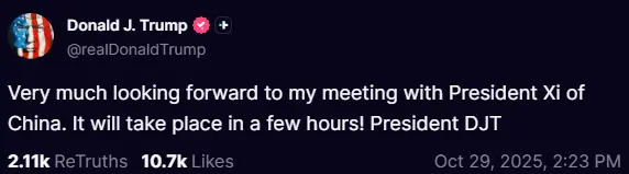 In a recent Truth Social post, President Trump said he was very much looking forward to the meeting with his Chinese counterpart. He believes meeting between the two could last three to four hours.
