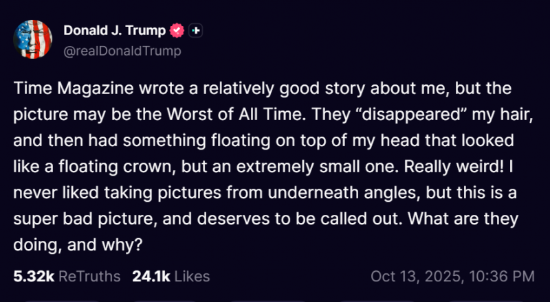 “It may be the worst photo of all time,” Trump wrote on Truth Social. “They could have used one of a thousand better pictures, but they chose this one on purpose. It’s really bad — shot from below, terrible lighting, and it makes my hair look see-through. Disrespectful!”