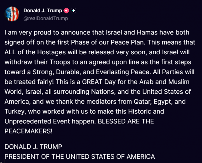 “I am very proud to announce that Israel and Hamas have both signed off on the first Phase of our Peace Plan. This means that ALL of the Hostages will be released very soon, and Israel will withdraw their Troops to an agreed upon line as the first steps toward a Strong, Durable, and Everlasting Peace. All Parties will be treated fairly! This is a GREAT Day for the Arab and Muslim World, Israel, all surrounding Nations, and the United States of America, and we thank the mediators from Qatar, Egypt, and Turkey, who worked with us to make this Historic and Unprecedented Event happen. BLESSED ARE THE PEACEMAKERS!” Trump wrote on the platform.