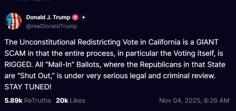 On Tuesday morning, Trump took to Truth Social to share his thoughts on Prop 50.