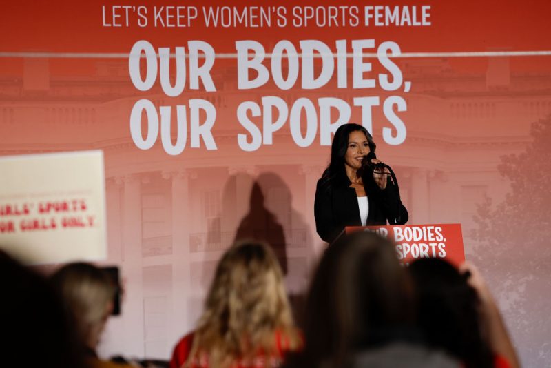 Former U.S. Rep. Tulsi Gabbard (D-HI) speaks at an “Our Bodies, Our Sports” rally to mark the 50th anniversary of Title IX at Freedom Plaza on June 23, 2022 in Washington, DC. The rally, organized by multiple athletic women’s groups was held to call on U.S. President Joe Biden to put restrictions on transgender females and “advocate to keep women’s sports female.”(Photo by Anna Moneymaker/Getty Images)