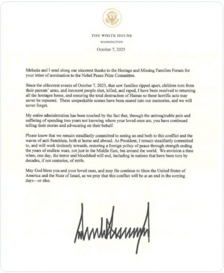 El martes, en el segundo aniversario del 7 de octubre de 2023, Trump envió una carta al Foro de Familias de Rehenes y Desaparecidos.