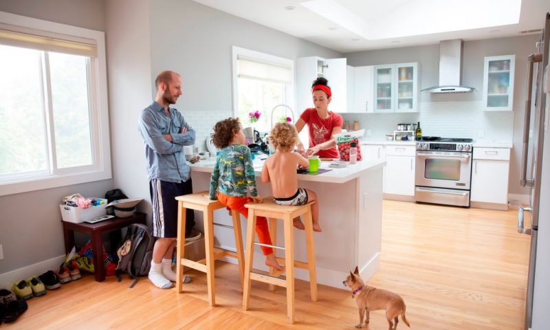 Kyala Brown (R) and her husband Danny Benjamin have lunch with their sins Levi Benjamin-Brown, 5, and Luca Benjamin-Brown, 2, at their new home in El Cerrito, California on September 11, 2020. - Brown's family previously lived in San Francisco but recently moved to the East Bay in order to be closer to family because of Covid-19 and babysitting needs. A work-from-home trend kicked into overdrive by the pandemic is disrupting a city long a Mecca for tech talent. Tech workers who flocked to San Francisco to be near Google, Facebook, Pinterest, Twitter and other internet firms are moving to parts of the US where life is slower and the cost of living cheaper. (Photo by Brittany Hosea-Small / AFP) (Photo by BRITTANY HOSEA-SMALL/AFP via Getty Images)