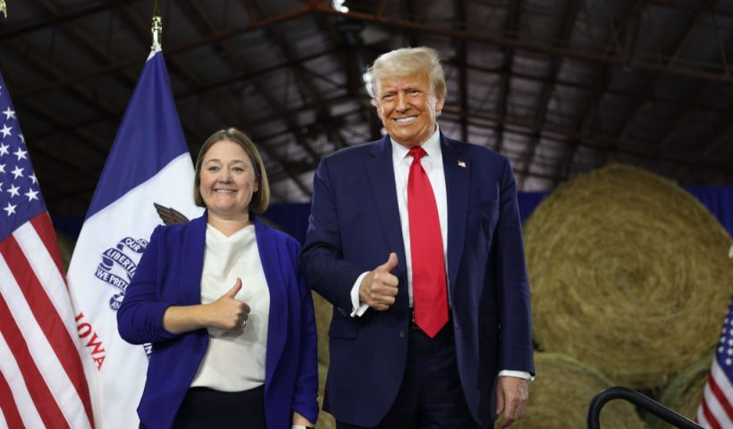 ADEL, IOWA - OCTOBER 16: Republican presidential candidate former President Donald Trump poses with Iowa Attorney General Brenna Bird after receiving her endorsement during a campaign event at the Dallas County Fairgrounds on October 16, 2023 in Adel, Iowa. Trump is also scheduled to speak at a rally in nearby Clive later in the afternoon. (Photo by Scott Olson/Getty Images)