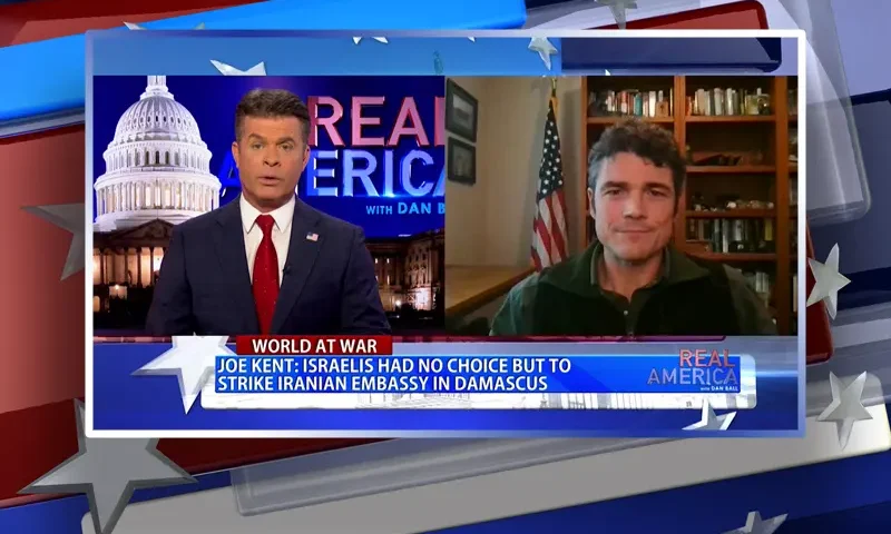 Video still from Real America on One America News Network showing a split screen of the host on the left side, and on the right side is the guest, Joe Kent.