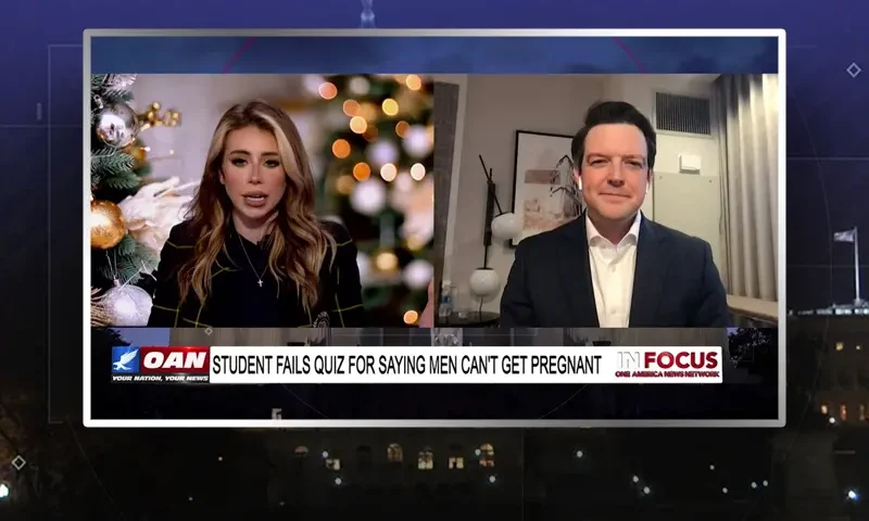 Video still from In Focus on One America News Network showing a split screen of the host on the left side, and on the right side is the guest, Ryan Helfenbein.