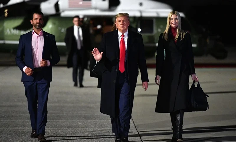 US President Donald Trump (C), daughter Senior Advisor Ivanka Trump and son Donald Trump Jr. (L) make their way to board Air Force One before departing from Dobbins Air Reserve Base in Marietta, Georgia on January 4, 2021. - President Donald Trump, still seeking ways to reverse his election defeat, and President-elect Joe Biden converge on Georgia on Monday for dueling rallies on the eve of runoff votes that will decide control of the US Senate. Trump, a day after the release of a bombshell recording in which he pressures Georgia officials to overturn his November 3 election loss in the southern state, is to hold a rally in the northwest city of Dalton in support of Republican incumbent senators Kelly Loeffler and David Perdue. (Photo by MANDEL NGAN / AFP) (Photo by MANDEL NGAN/AFP via Getty Images)