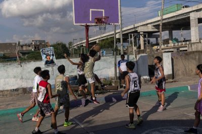 Boys play basketball at a makeshift court by the Navotas River in Navotas, Metro Manila, Philippines, August 15, 2023. A banner reading “Justice for Jemboy” is pinned beside the basketball ring in memory of the 17-year-old boy who used to play in the same court. Jemboy Baltazar was killed by police on August 2 in what the police later said was a case of mistaken identity. REUTERS/Eloisa Lopez