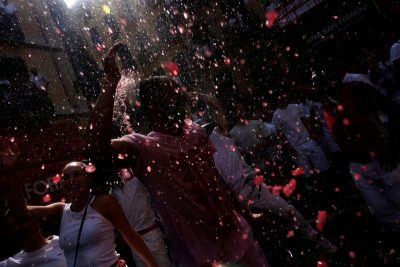Revellers shower in wine during the opening of Sanfermines in Pamplona, Spain, July 6, 2023. The famed bull-running festival engulfs downtown Pamplona every July when revellers from around the globe descend upon the northern Spanish city for nine days of adrenaline, sweat and debauchery savoured as freely as the wine flows. Some are drawn to the Sanfermines – as the festival is popularly known – by the timeless prose of Ernest Hemingway who became besotted with the Sanfermines on his first visit, exactly 100 years ago. The bull-running, the bullfighting local experts – and the hedonistic partying – captivated him so deeply that he returned eight times between 1924 and 1959. REUTERS/Susana Vera