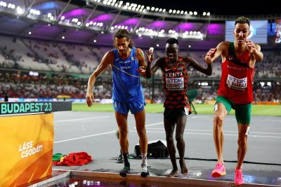 Athletics – World Athletics Championship – National Athletics Centre, Budapest, Hungary – August 22, 2023 Gold medallist Italy’s Gianmarco Tamberi in the men’s high jump, gold medallist Morocco’s Soufiane El Bakkali and bronze medallist Kenya’s Abraham Kibiwot in the men’s 3000m steeplechase celebrate after the finals REUTERS/Kai Pfaffenbach