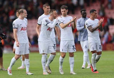 Soccer Football – Premier League – AFC Bournemouth v Tottenham Hotspur – Vitality Stadium, Bournemouth, Britain – August 26, 2023 Tottenham Hotspur’s Ben Davies, James Maddison, Pedro Porro and Oliver Skipp celebrate after the match REUTERS/David Klein