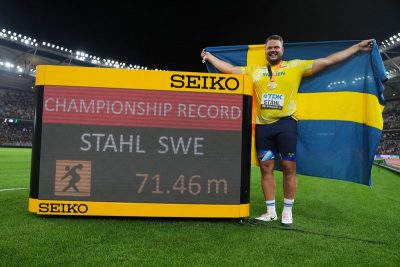 Athletics – World Athletics Championship – Men’s Discus Throw Final – National Athletics Centre, Budapest, Hungary – August 21, 2023 Sweden’s Daniel Stahl poses with the Championship Record sign after winning gold REUTERS/Aleksandra Szmigiel