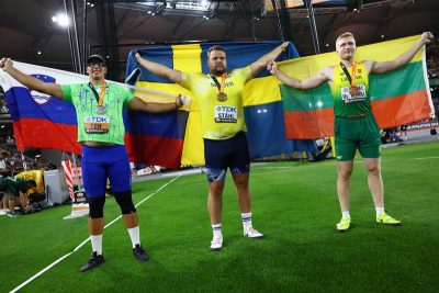 Athletics – World Athletics Championship – Men’s Discus Throw Final – National Athletics Centre, Budapest, Hungary – August 21, 2023 Sweden’s Daniel Stahl celebrates with the gold medal after winning the Men’s Discus Throw alongside silver medalist Slovenia’s Kristjan Ceh and bronze medalist Lithuania’s Mykolas Alekna REUTERS/Kai Pfaffenbach