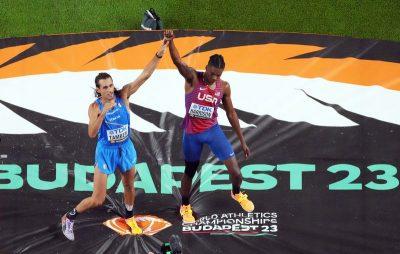 Athletics – World Athletics Championship – Men’s High Jump Final – National Athletics Centre, Budapest, Hungary – August 22, 2023 Italy’s Gianmarco Tamberi celebrates after winning gold alongside silver medalist JuVaughn Harrison of the U.S. REUTERS/Fabrizio Bensch